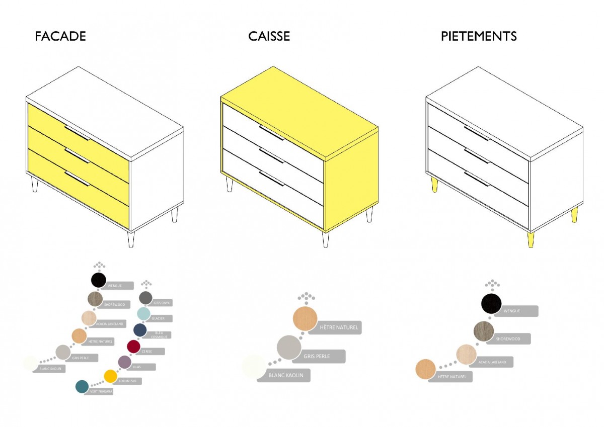 Pieds réalisés en hêtre massif. Les arêtes du produit sont cassées par un arrondi. Caisse en panneau mélaminé d'épaisseur 19 mm et plateau mélaminé d'épaisseur 38 mm. 3 tiroirs réalisés en panneaux mélaminés d'épaisseur 19 mm.