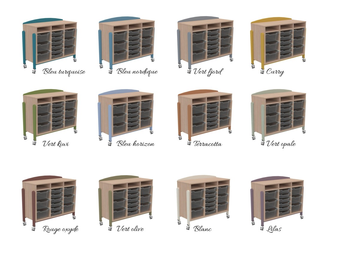 Dimensions hors tout : H 960 x P 450 x L 1097 mm. Caisse du meuble réalisée en panneau mélaminé d'épaisseur 19 mm, avec chant PVC de 2 mm. Assemblage de la caisse par tourillons. Piétement réalisé en hêtre massif, assemblé par tenons et mortaises. Toutes les pièces ont les arêtes cassées par un arrondi. Équipé de 4 roulettes, dont 2 équipées de freins (D50 mm). Finition vernis hydro (à l'eau, sans solvant). Glissières plastiques, avec système en fin de course (stop’n tilt).